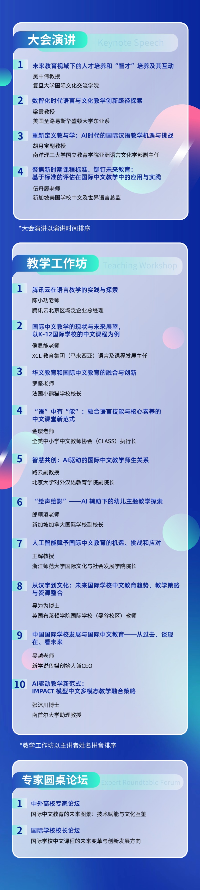 本届研讨会分设4场大会主题演讲和10场教学工作坊,邀请了来自中国、新加坡、美国、法国、泰国、马来西亚、韩国7个国家的知名专家学者和一线教师发表演讲。此外,大会设有“中外高校专家论坛”和“国际学校校长论坛”2场圆桌论坛,特别邀请国际中文教学领域知名专家和国际学校校长,就“国际中文教育的未来图景:技术赋能与文化互鉴”以及“国际学校中文课程的未来变革与创新发展方向”等主题与参会者展开交流与探讨。